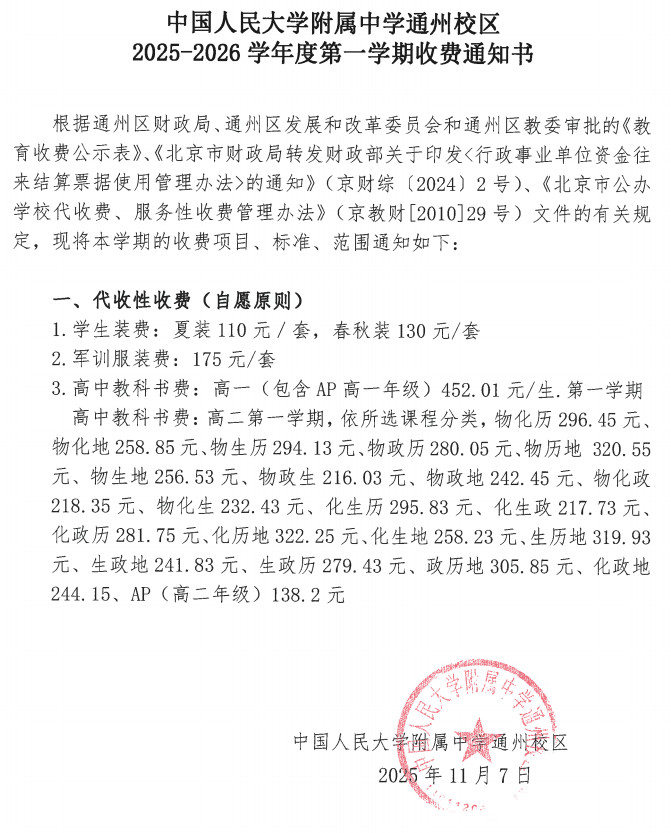 中国人民大学附属中学通州校区2025-2026学年度第一学期收费通知书
