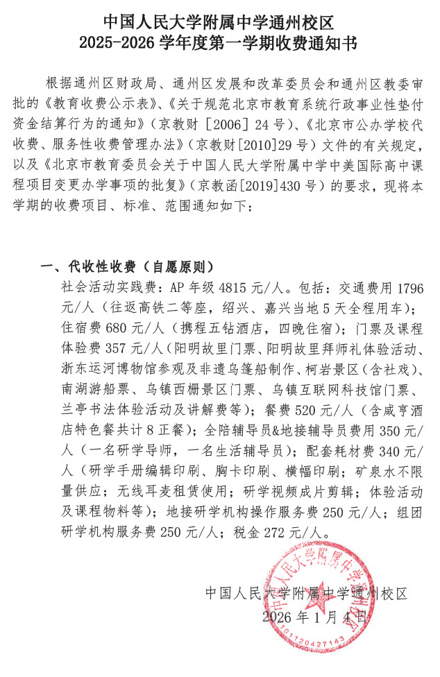 中国人民大学附属中学通州校区2025-2026学年度第一学期收费通知书(社会活动实践费)